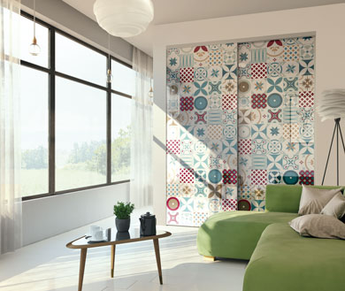 Ce qui fonctionne le mieux ? Délimiter les espaces au sol, on adore ! Donner du peps avec un pan de mur, on dit oui ! Mais plus original encore… le carreau de ciment s’invite sur votre porte de placard en vitre laquée. À mi-chemin entre le charme du motif ancien et la modernité des matériaux, il s’assortit parfaitement aux vitres bordeaux et sables de la gamme COULIDOOR.