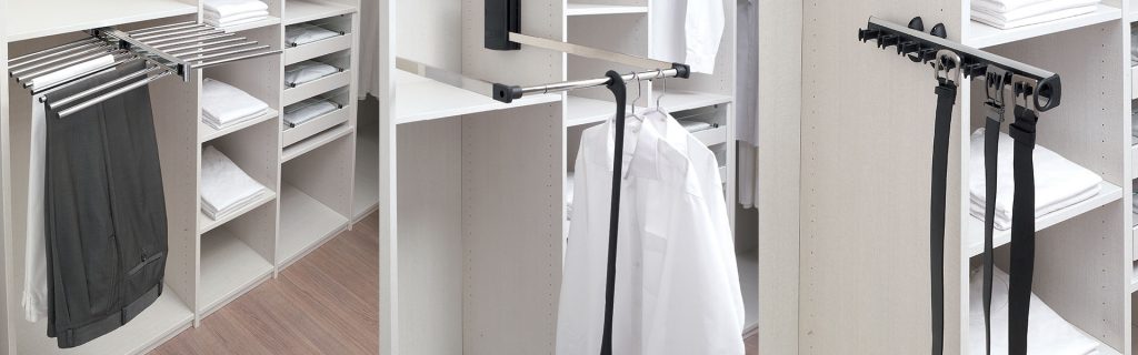 Que vous aimiez ranger vos cravates dans un tiroir ou accrochées à un porte-cravates, le sur-mesure vous garanti un dressing qui vous correspond. Prenez le temps d’identifier vos habitudes de rangement et déterminez le type d’accessoires de dressing dont vous avez besoin. COULIDOOR vous propose un large choix, du porte pantalons au porte-jupes, de l’accroche tout à la penderie télescopique, en passant par le porte foulards coulissant. Autant de solutions originales qui vous permettrons également d’optimiser l’espace.