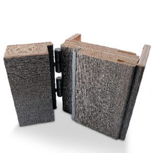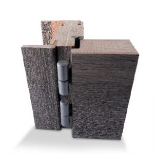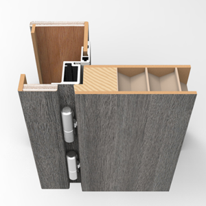 Porte à recouvrement, épaisseur totale 43 mm. Âme alvéolaire déshydraté de 35 mm dans des montants en sapin massif 27 x 35 mm, parements en MDF hydrofuge 4 mm avec revêtement en mélaminé ou laque haute structure.