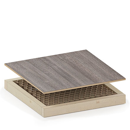 Une structure de carton déshydraté alvéolaire (nid d’abeille) dans un cadre en pin massif.