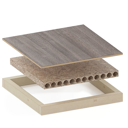 La structure de la porte est tubulaire, avec un cœur en panneau de particules et toujours des montants en pin massif.
