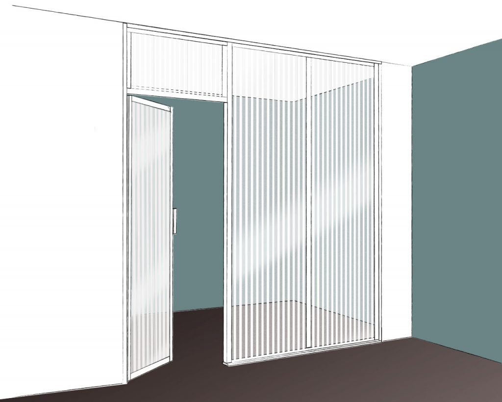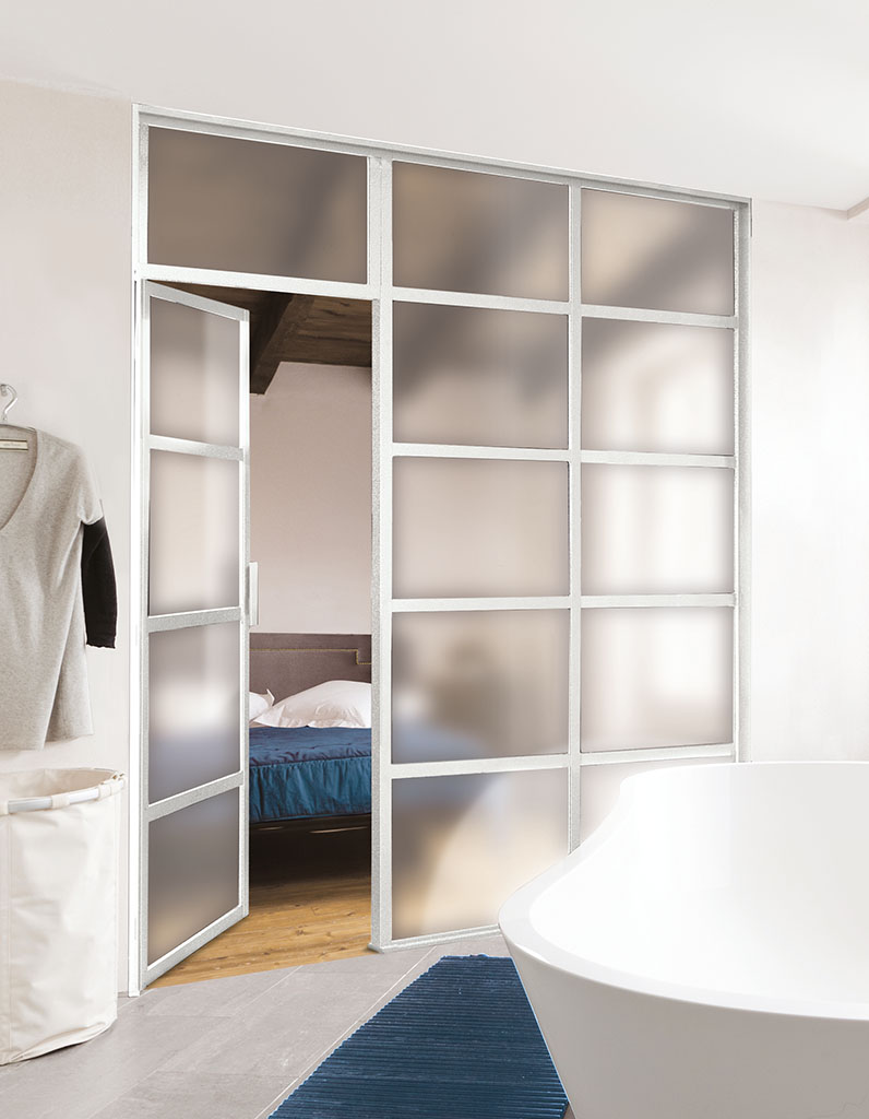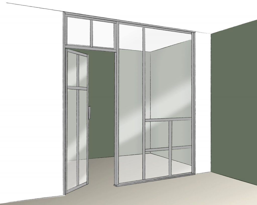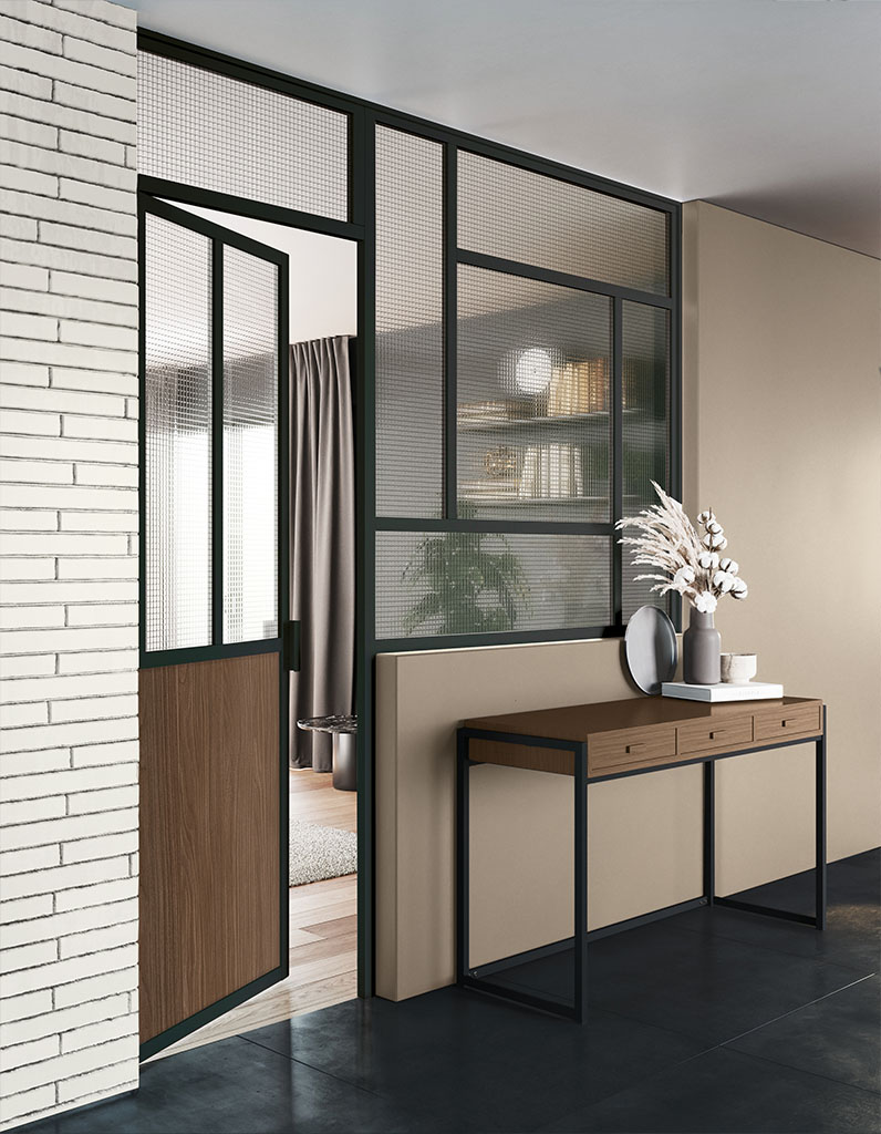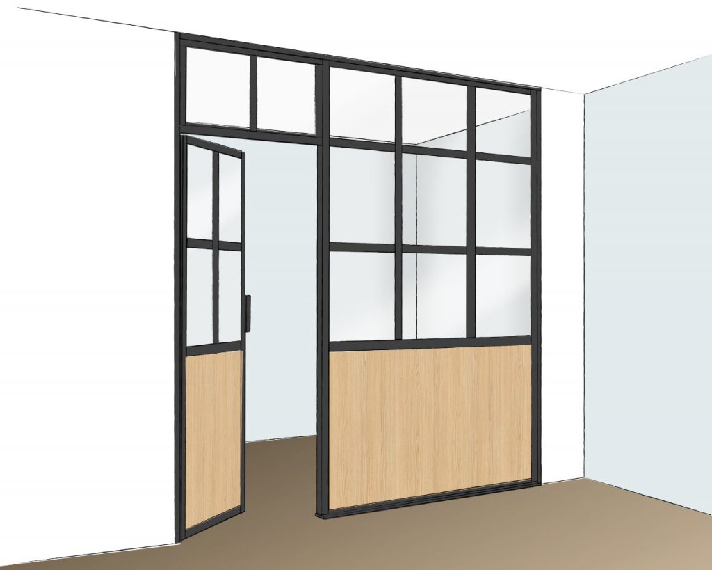 La porte peut être tout hauteur ou finie par une imposte pour garder l’esprit verrière jusque dans les moindres détails.