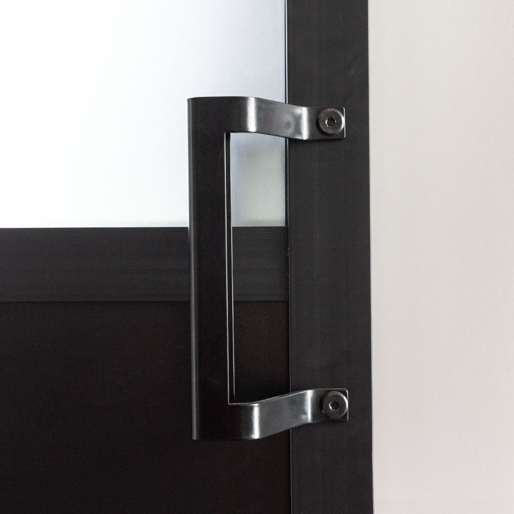Dans les cas de deux portes, les battants sont équipés de poignées déportées par défaut pour ne pas gêner la fermeture des portes.
