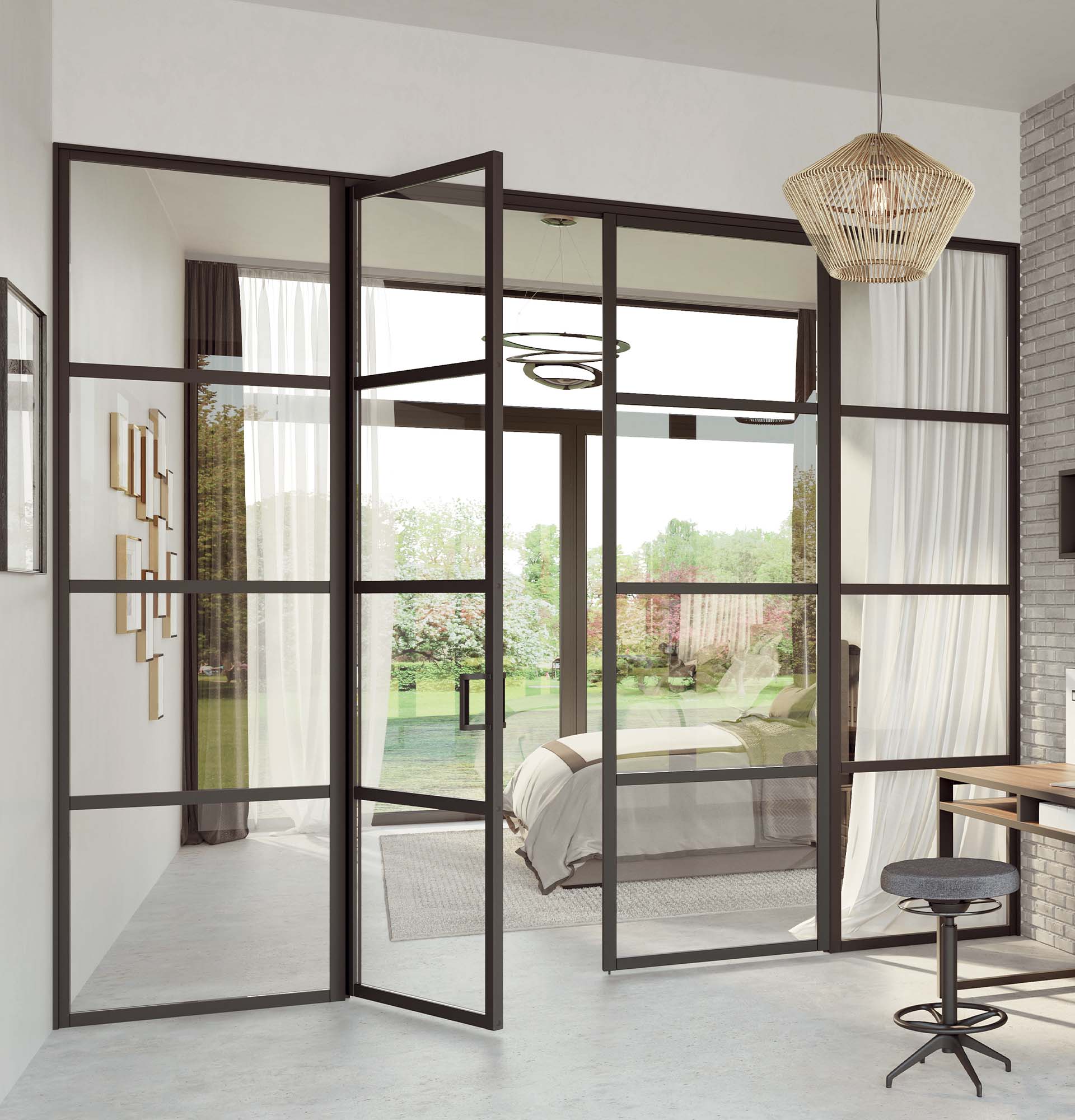 Le cadre peut venir en complément de verrières fixes ou être installé de manière indépendante entre des murs existants. La porte est ensuite posée sur des charnières invisibles réglables, pour être parfaitement alignée à l’ensemble. Dès lors, les possibilités sont nombreuses : isoler une alcôve existante, créer une pièce entière dans un grand espace, etc. Il suffit de laisser parler votre imagination.