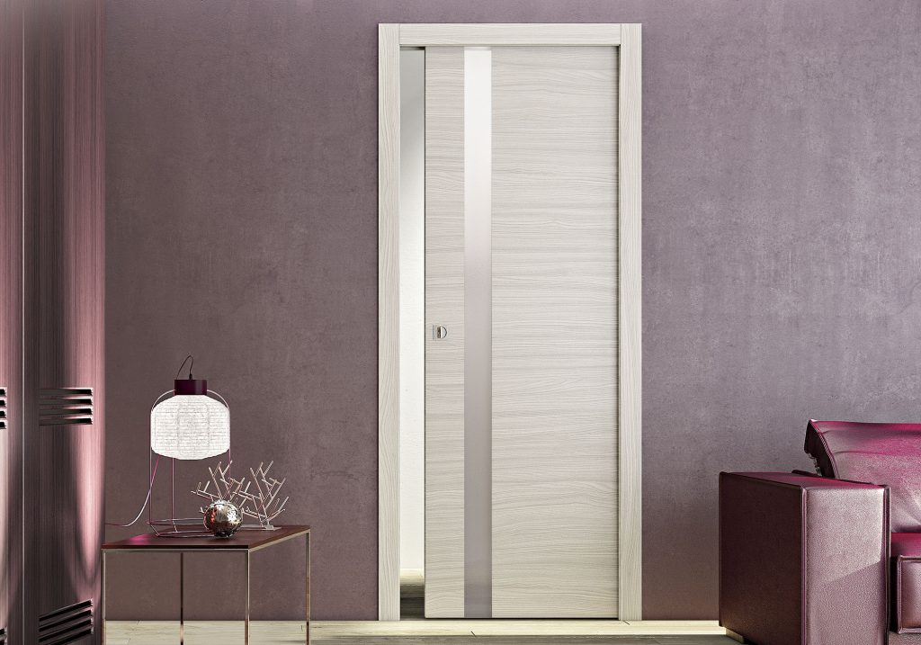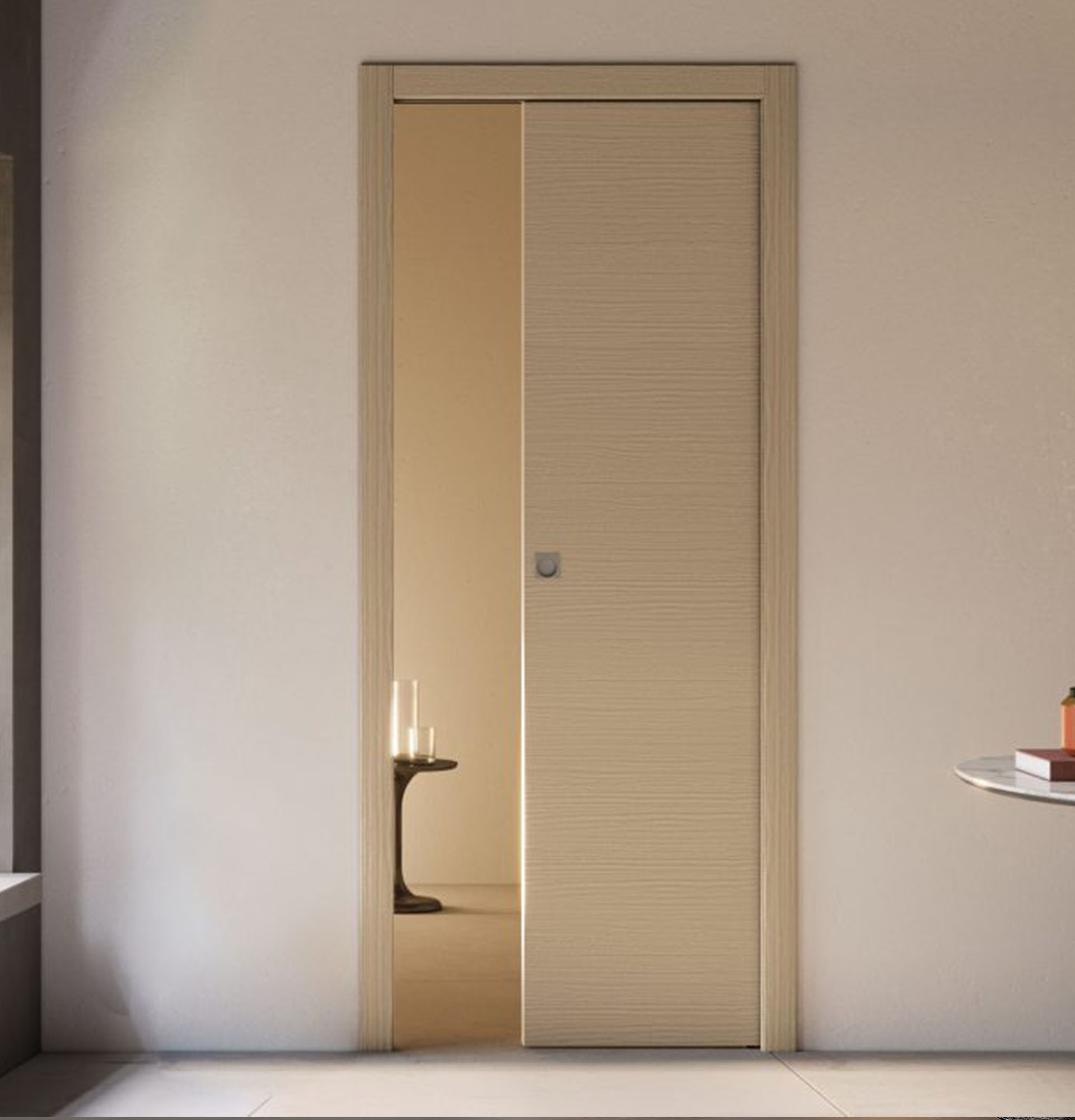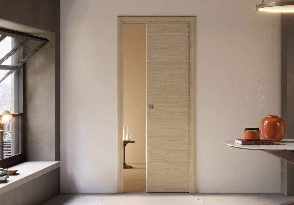 Une porte et un kit de finition compatible avec la plupart des châssis à galandage du marché