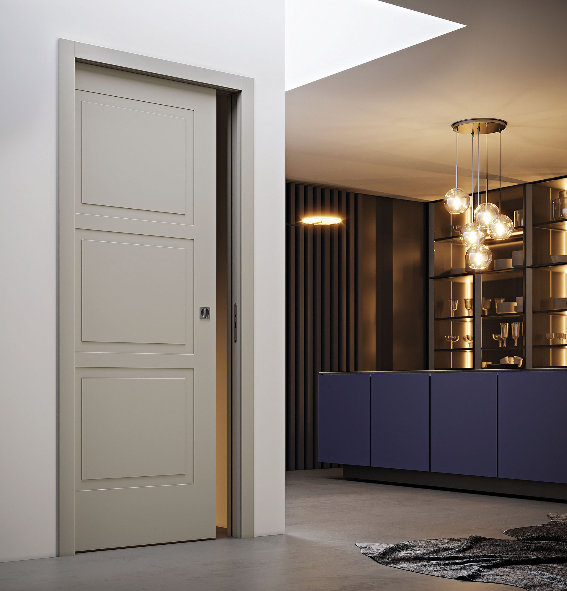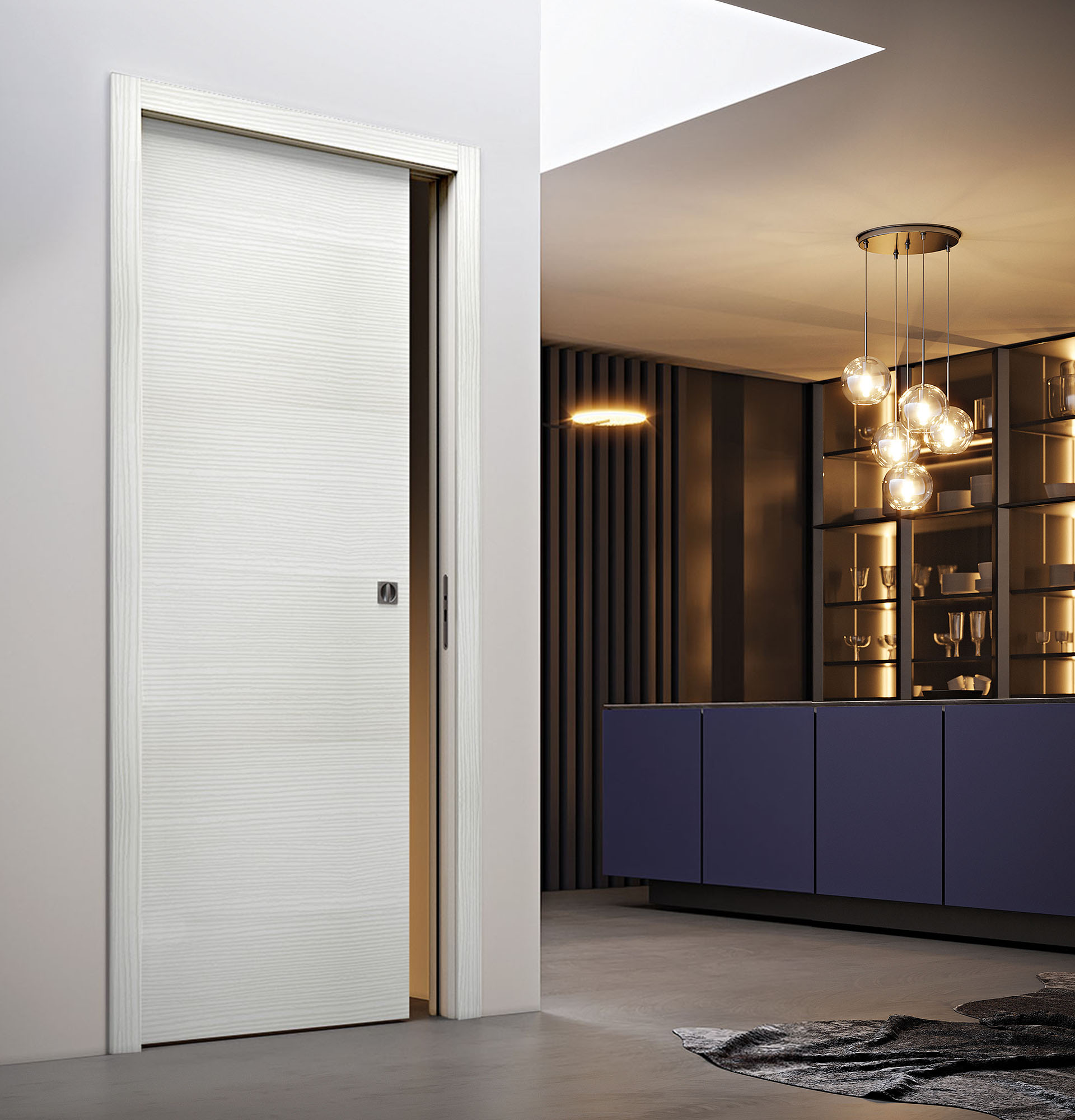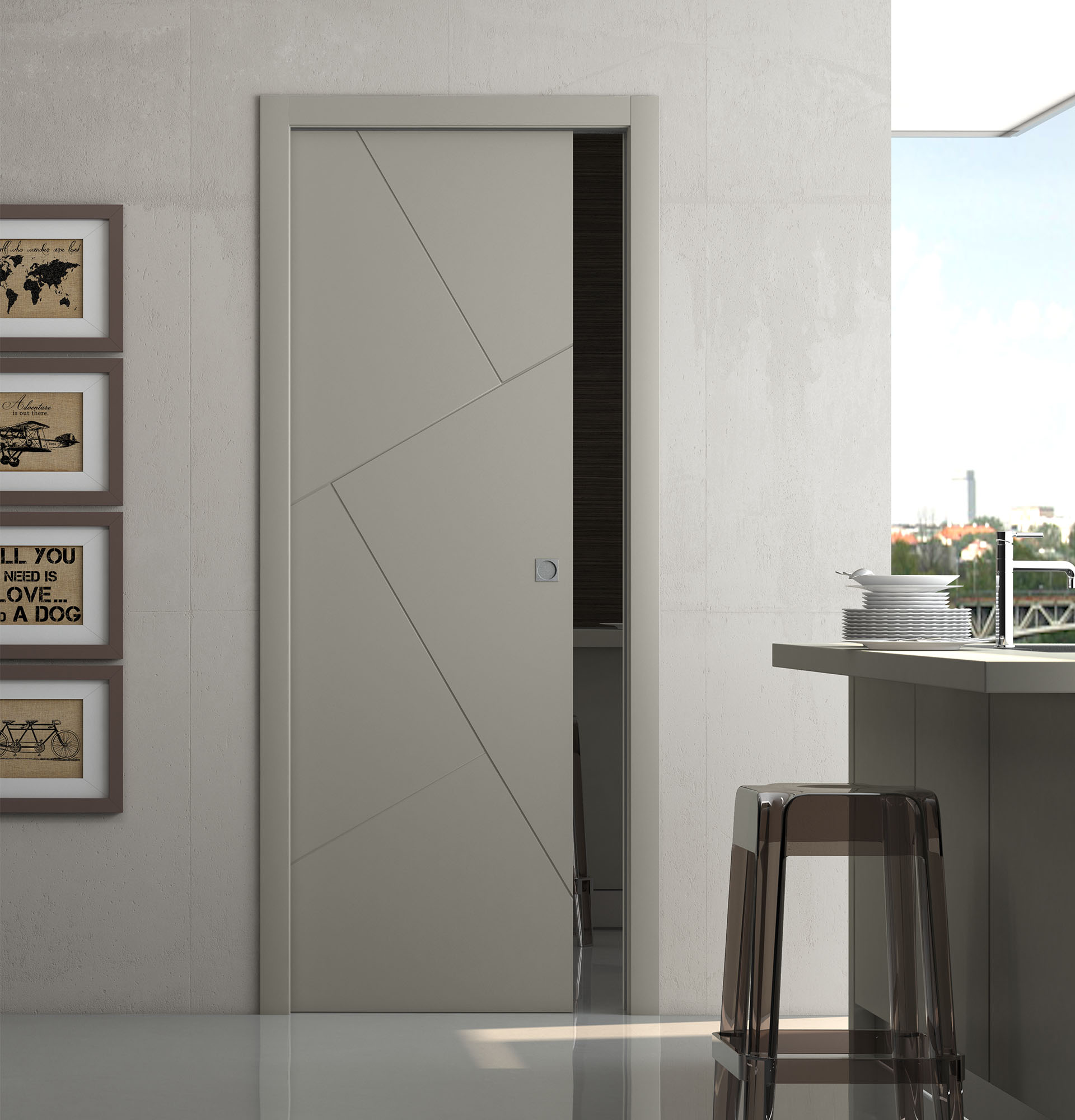 La porte coulissante DISPO reprend ce qui fait l’essence de la qualité PAIL : des décors sobres et un modèle épuré, qui s’intègrent facilement dans une ambiance.