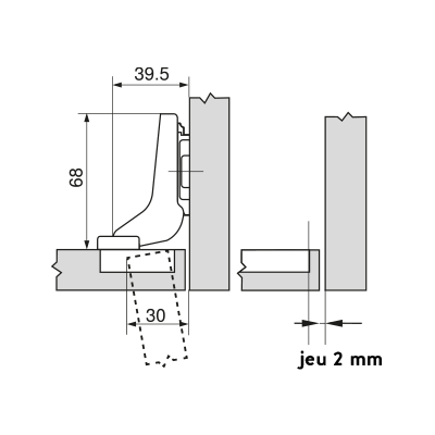 Charnière coudée de 0 (applique).Recouvrement 17 mm sur élément vertical.