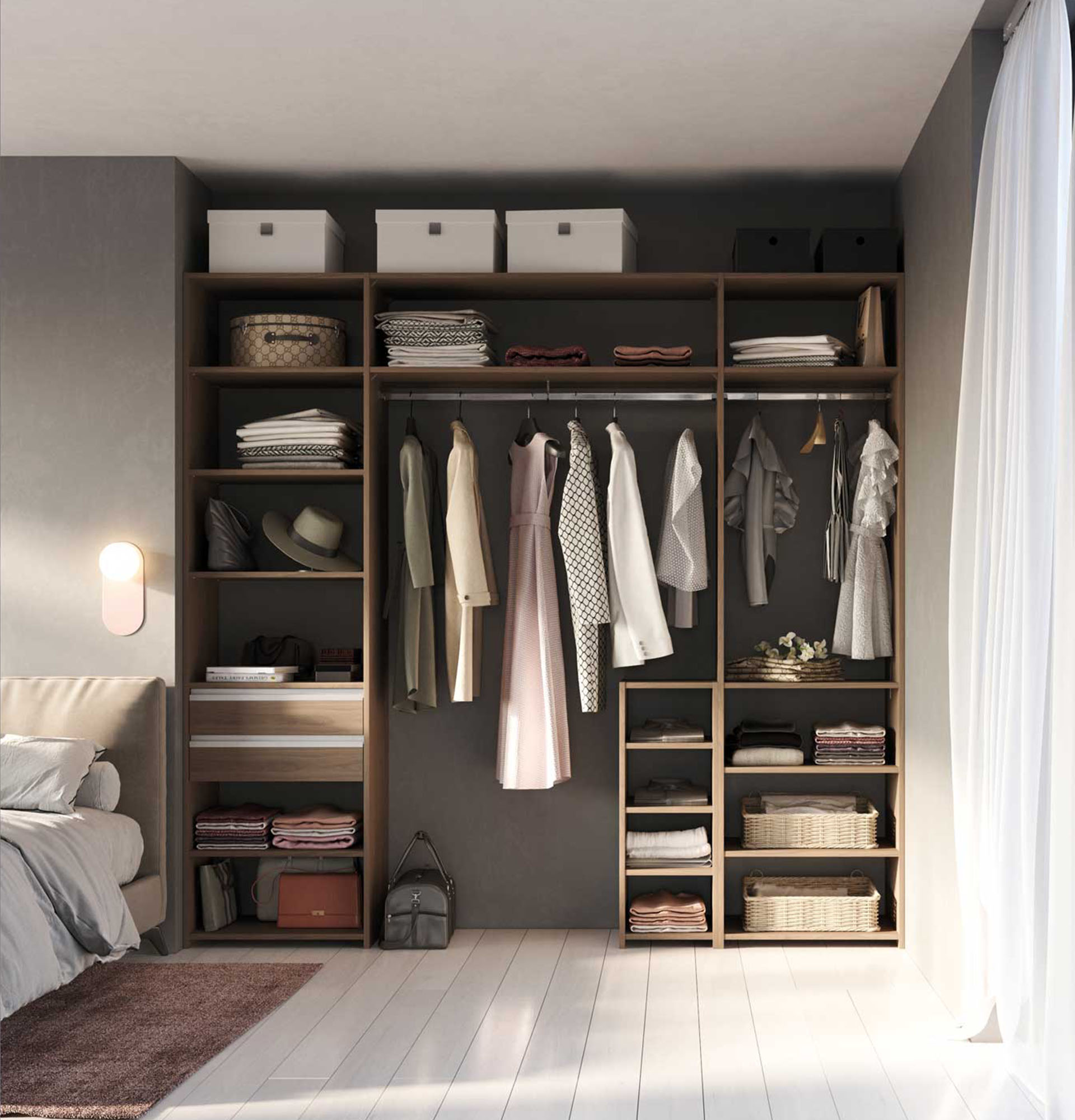 Disponible dans la plupart des décors 19 mm de notre gamme, cette première configuration permet de ranger le nécessaire d’une chambre sans effort.  Avec ses nombreuses couleurs, ce dressing peut s’installer dans tous les intérieurs.