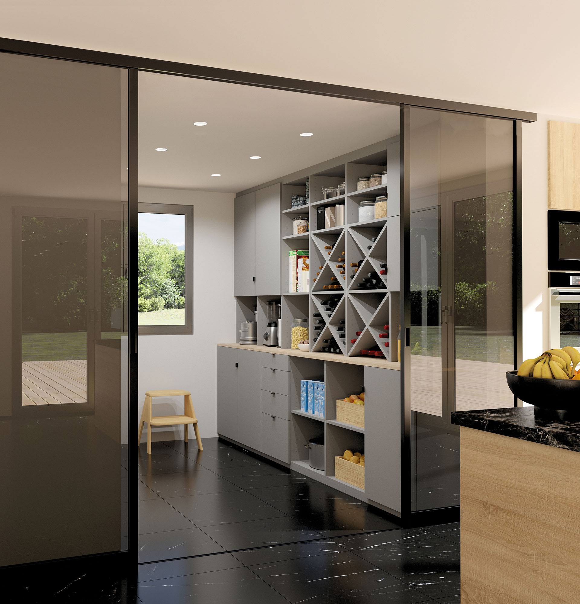Le profil Cristal est le plus adapté pour s'associer aux verrières. Tout en sobritété, il souligne la séparation de pièce sans fioritures. Avec un vitrage clair, cette séparation ne diminue pas la luminosité et donne de la profondeur à vos espaces.