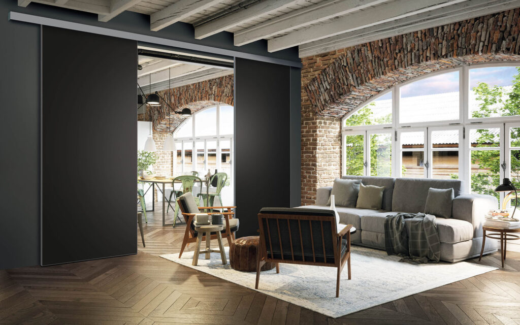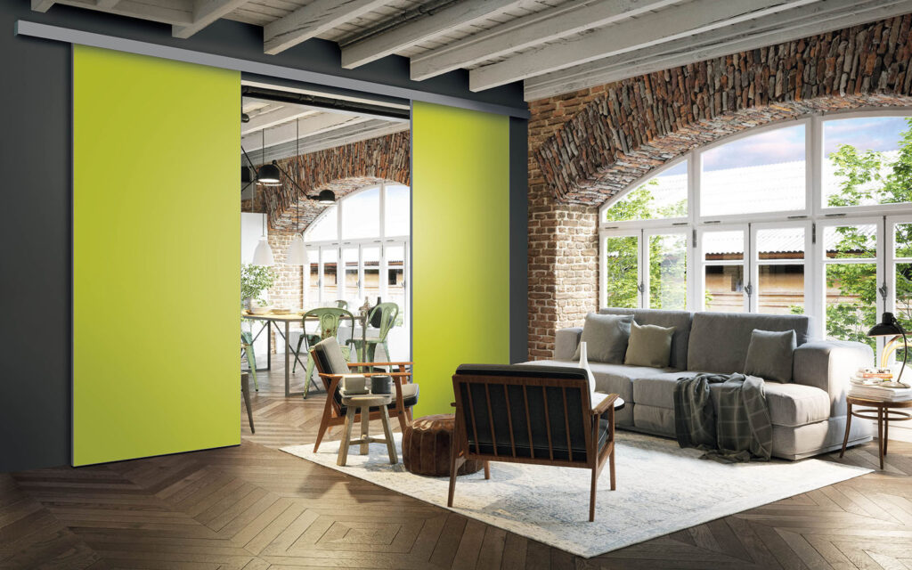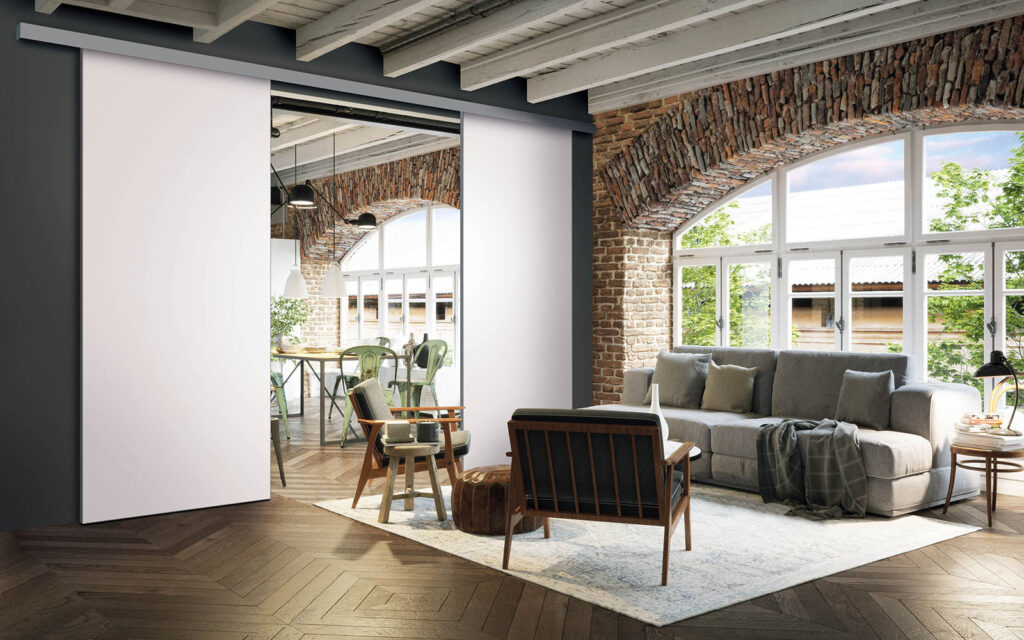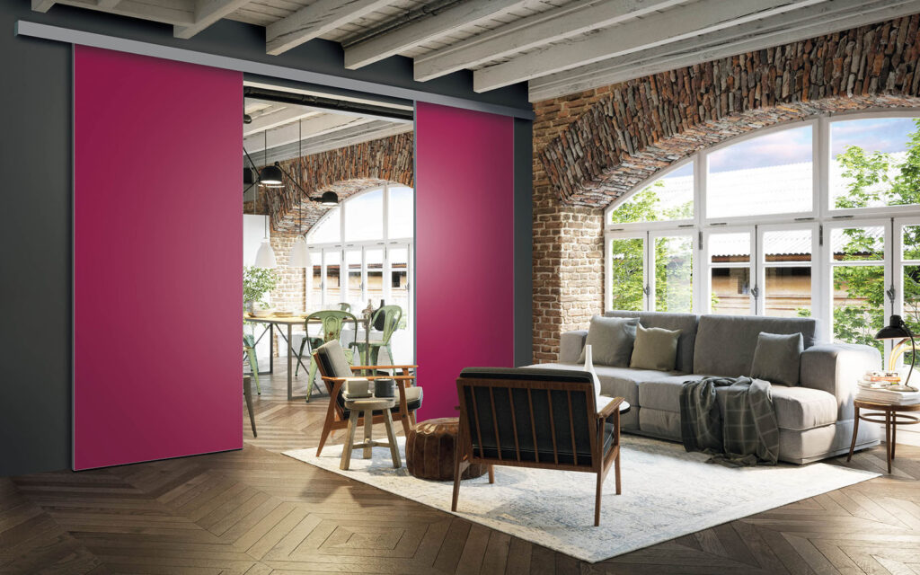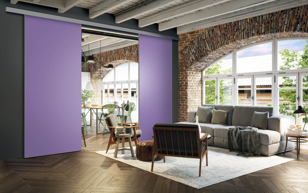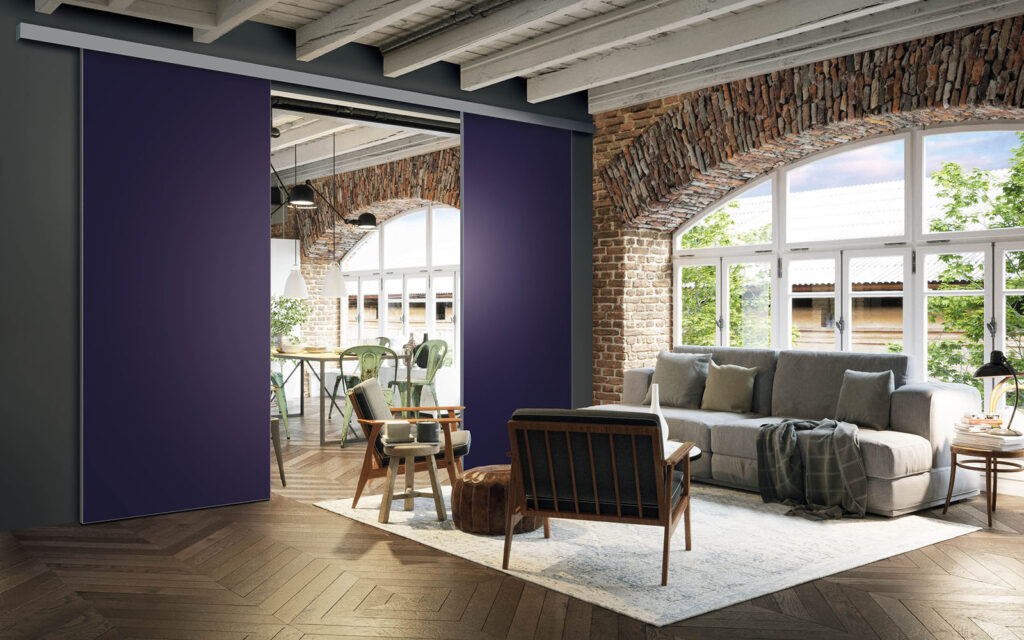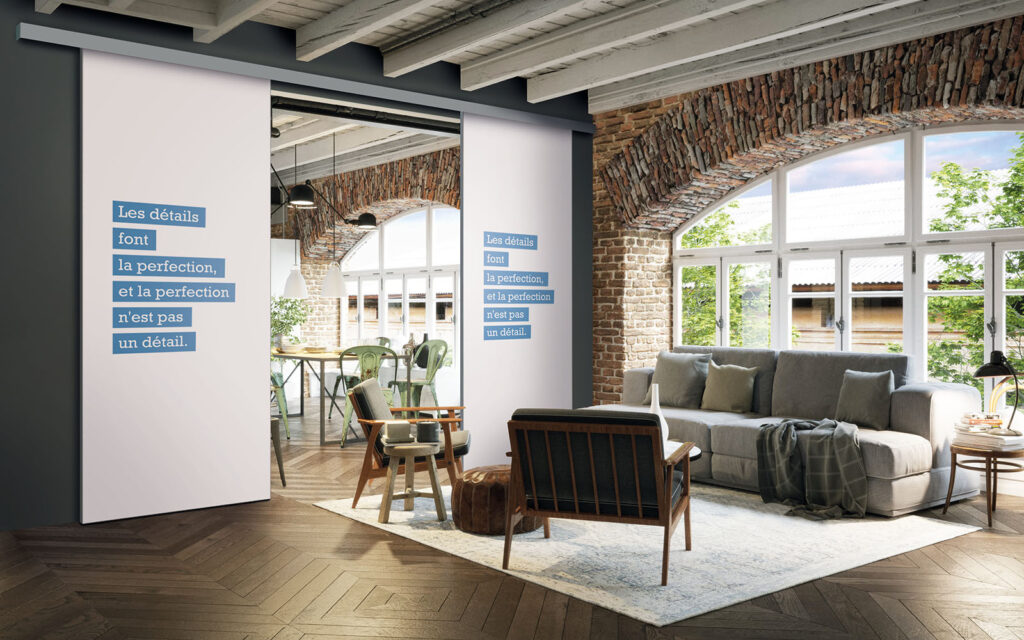 La pose d’une séparation de pièces ne nécessite pas de gros travaux :  son rail peut être posé au plafond ou en applique (sur un mur).  Utilisant le système Altitude de Coulidoor, elle ne présente pas de rail au sol. De cette manière, le passage se fait sans encombre. Comme elle est coulissante, la séparation de pièces s’adapte à votre intérieur sans prendre de place.