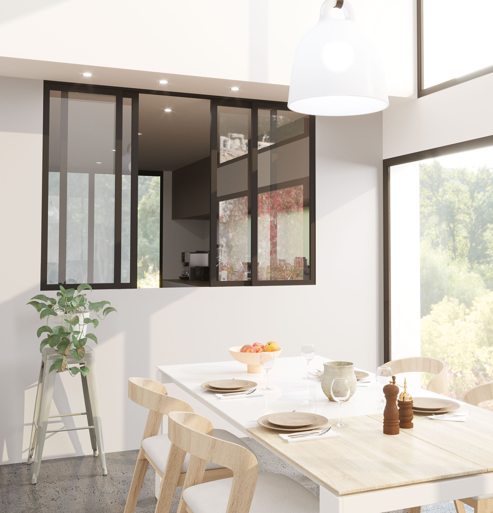 Cette verrière faisant office de passe-plat se compose d'une partie fixe et d'une partie mobile.